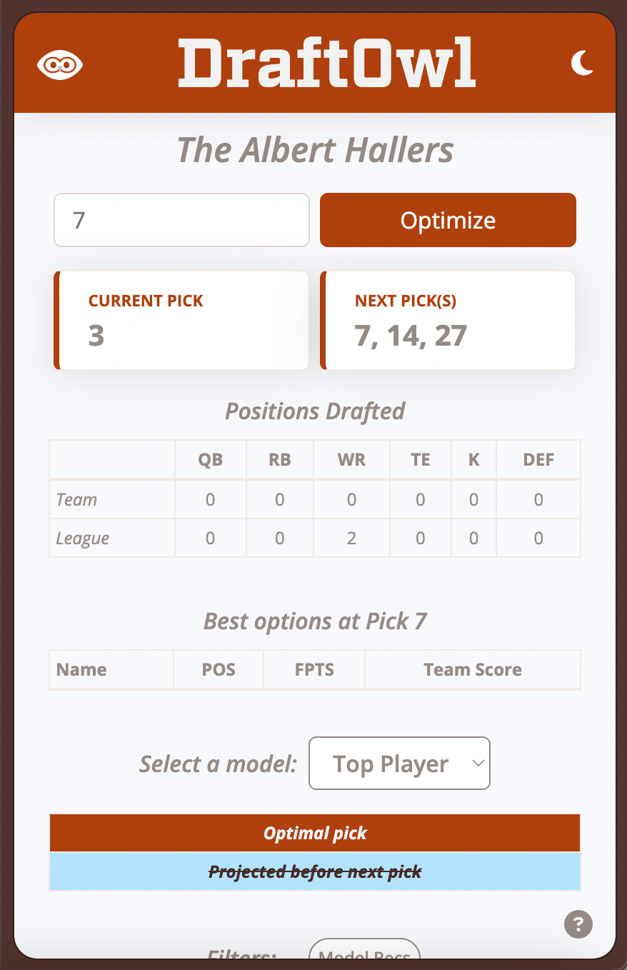 Click “Optimize” after each pick to update your DraftOwl suggestion