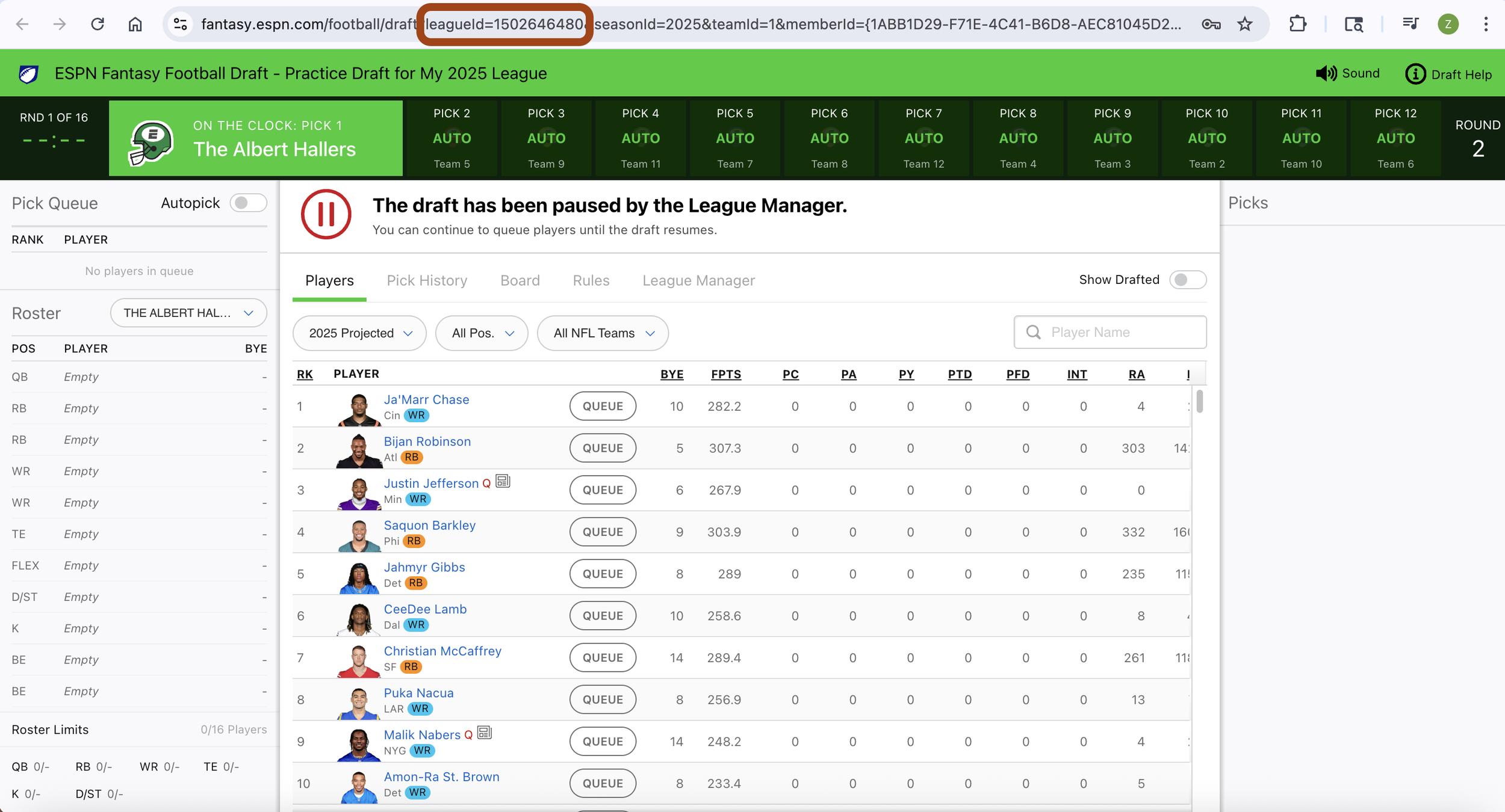 On the main page, fill out the field “League ID”. Once you’ve entered your official draft (not the league home page, the draft itself), look for the term leagueid=xxxxx in the url. and paste that number into the field.