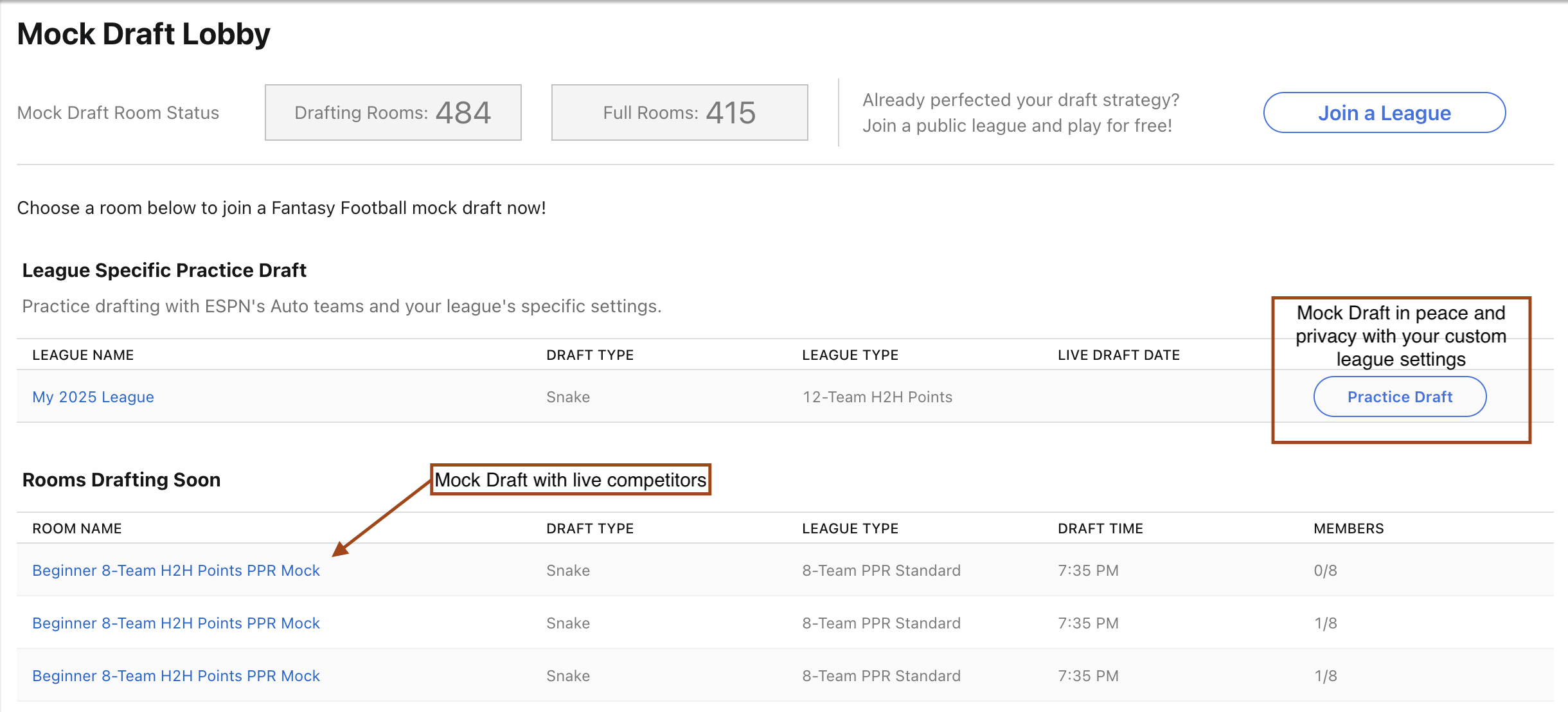 Go to https://fantasy.espn.com/football/mockdraftlobby and refer to the following image to start your mock draft